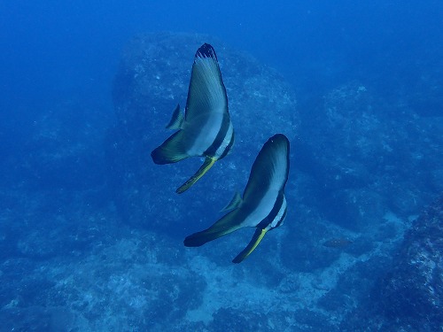 ロープ沿いに潜降していくと、まずはツバメウオがお出迎え!